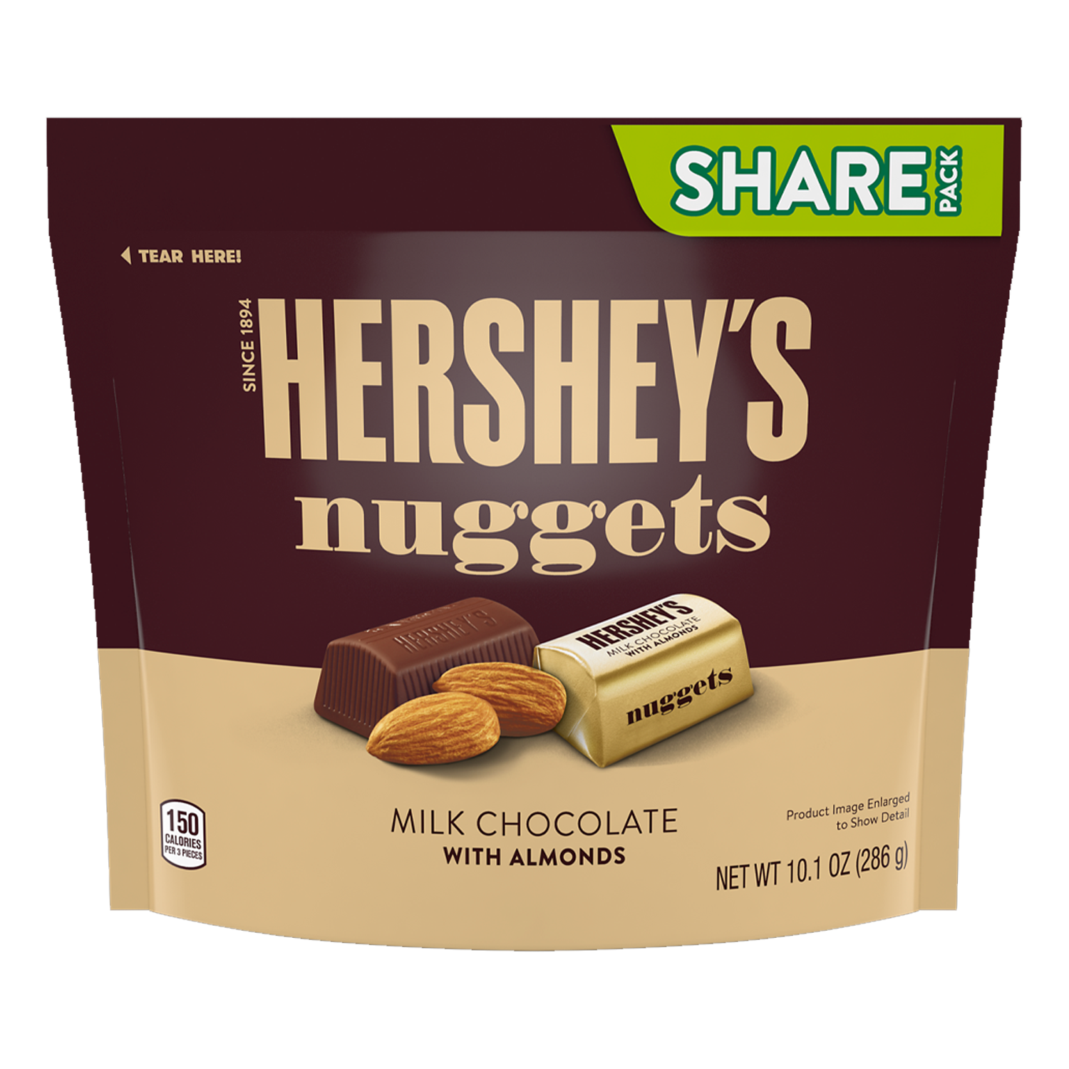 HERSHEY'S NUGGETS milk chocolate and almond candy family pack is filled with delicious chocolate pieces. Everyone will love these hearty milk chocolates wrapped in gold foil. Each two-bite bar is chock full of crunchy almond bits covered in rich milk chocolate. Dress up the table with a bowlful, or drop a handful in a party bag and wrap it with a gold ribbon for an instant, anytime gift. These chocolate nuggets are perfect for any holiday, from Halloween to Easter, and can liven up parties and get-togethers. This family pack comes with individually wrapped chocolates for easy storing or snacking on the go.