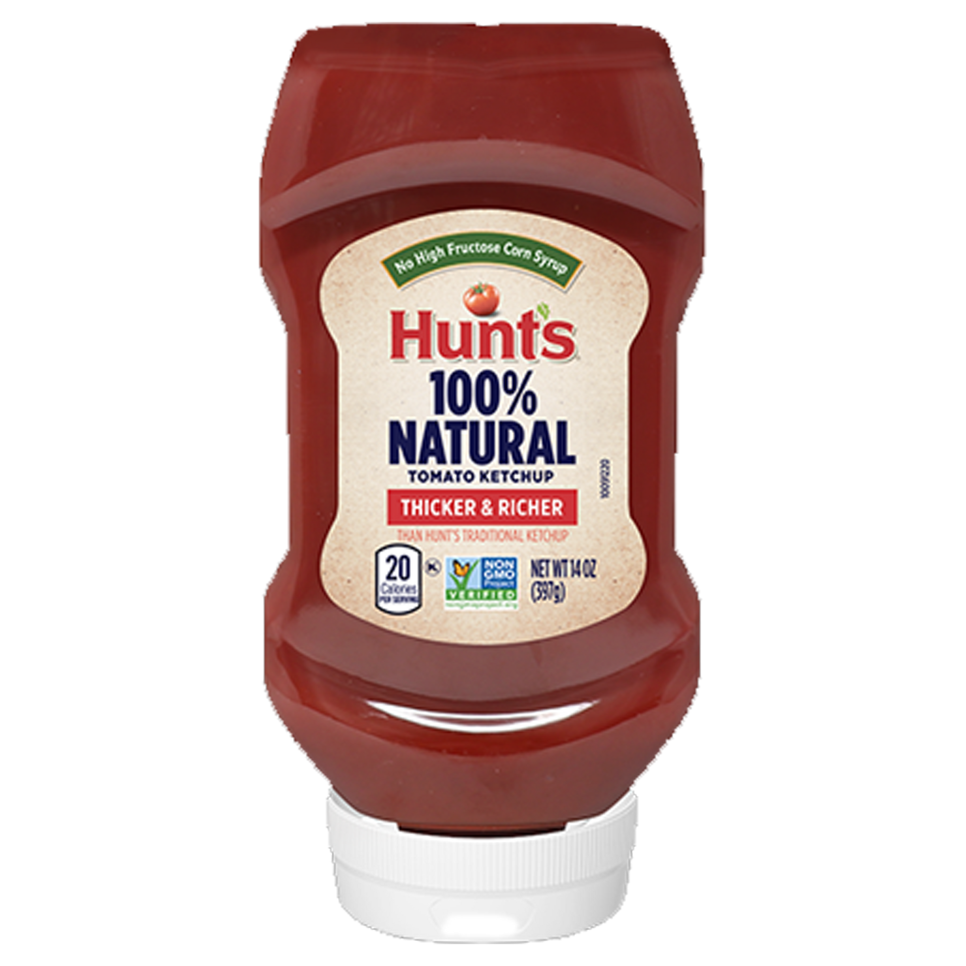 Savour the thick, tasty goodness of Hunt's 100% Natural Tomato Ketchup, an all-natural condiment ideal for families. Made without high-fructose corn syrup, Hunt's natural ketchup is great on burgers, fries, tots, and more. Hunt's ketchup is made from red-ripe tomatoes and choice seasonings and spices, producing a thick, rich sauce.