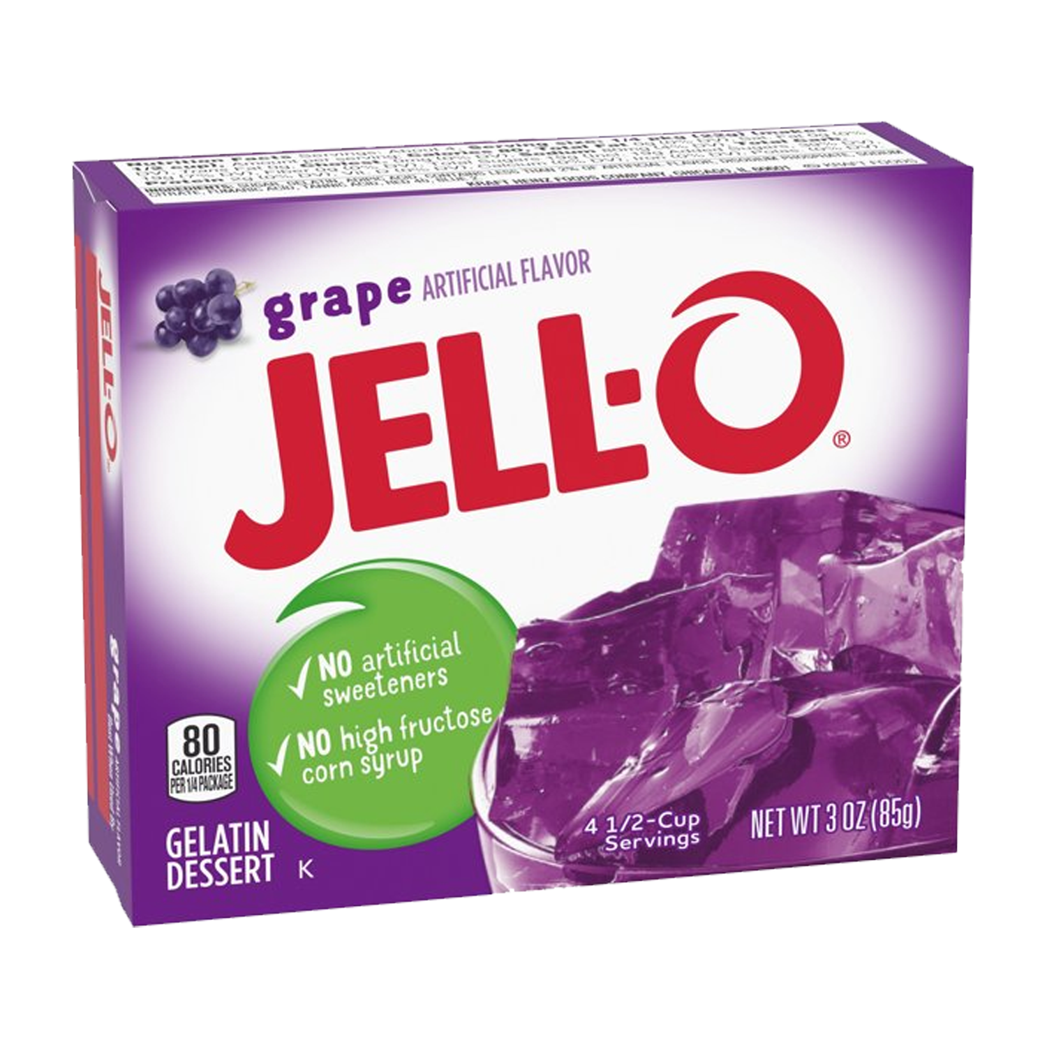 Jell-O Grape Instant Gelatin Mix is an easy to make grape flavored dessert. Perfect for cooling off on a hot day, this mouthwatering treat delivers the classic refreshingly sweet grape taste you know and love. With no artificial sweeteners and no high fructose corn syrup and fat free, this dessert is one you can feel good about sharing with your family.