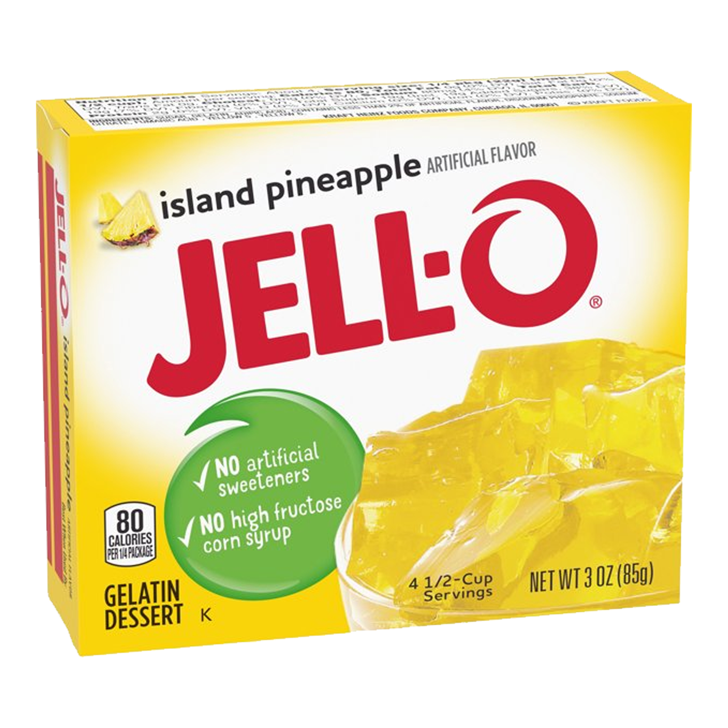 Jell-O Island Pineapple Instant Gelatin Mix is an easy to make pineapple flavored dessert. Perfect for cooling off on a hot day, this mouthwatering treat delivers the classic refreshingly sweet pineapple taste you know and love. With no artificial sweeteners and no high fructose corn syrup and fat free, this dessert is one you can feel good about sharing with your family.