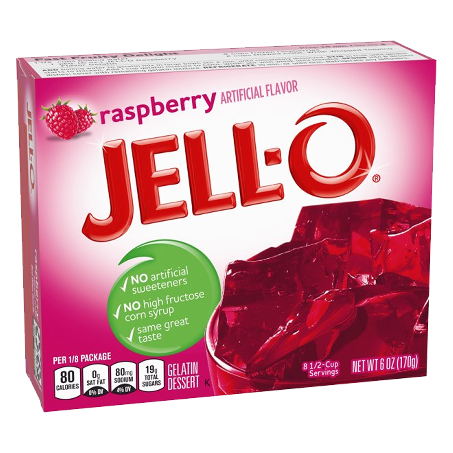 A berry-licious treat that's sure to delight! Make a snack for the whole family or try a new Pinterest recipe with Jello Raspberry Gelatin Dessert Mix. Our delicious gelatin dessert is easy to make; simply add boiling water to the gelatin mix, stir in cold water and put it in the refrigerator to set for about four hours. Jello gelatin mix contains no artificial sweeteners or high-fructose corn syrup and has only 80 calories per serving. The cool, fruity taste of Jello Raspberry Gelatin Dessert Mix is a perfect treat all by itself or used in colourful poke cakes, layered Jello molds, pies and more.