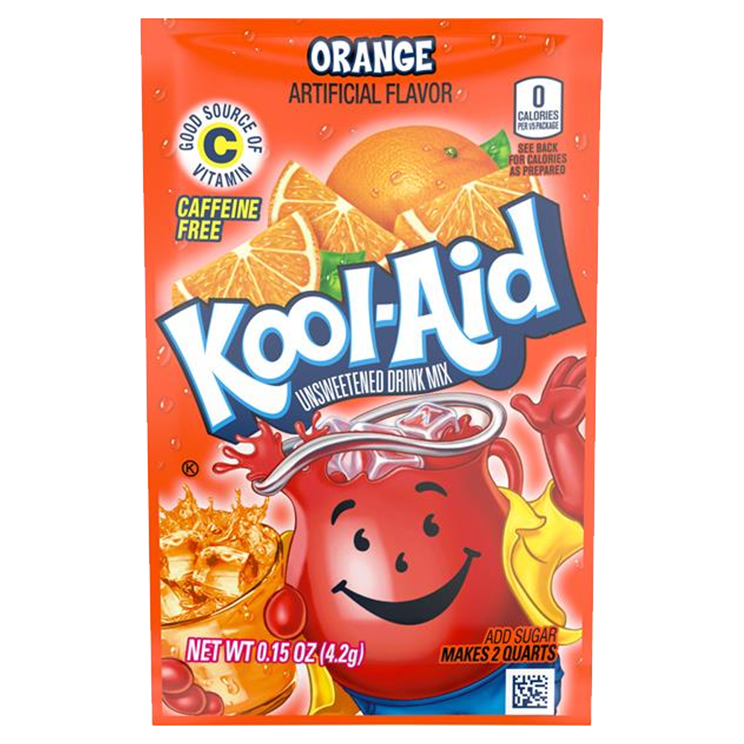 Kool-Aid Artificially Flavored Orange Unsweetened Powdered Drink Mix is a delicious way to stay hydrated. This unsweetened powdered drink mix makes it easy to prepare a tasty orange drink. Just mix it with water and sugar or your sweetener of choice. Quench your thirst with the refreshingly sweet and citrusy taste of oranges. With no caffeine, this artificially flavoured powdered drink mix is always a great choice for the whole family. It's also a good source of vitamin C.