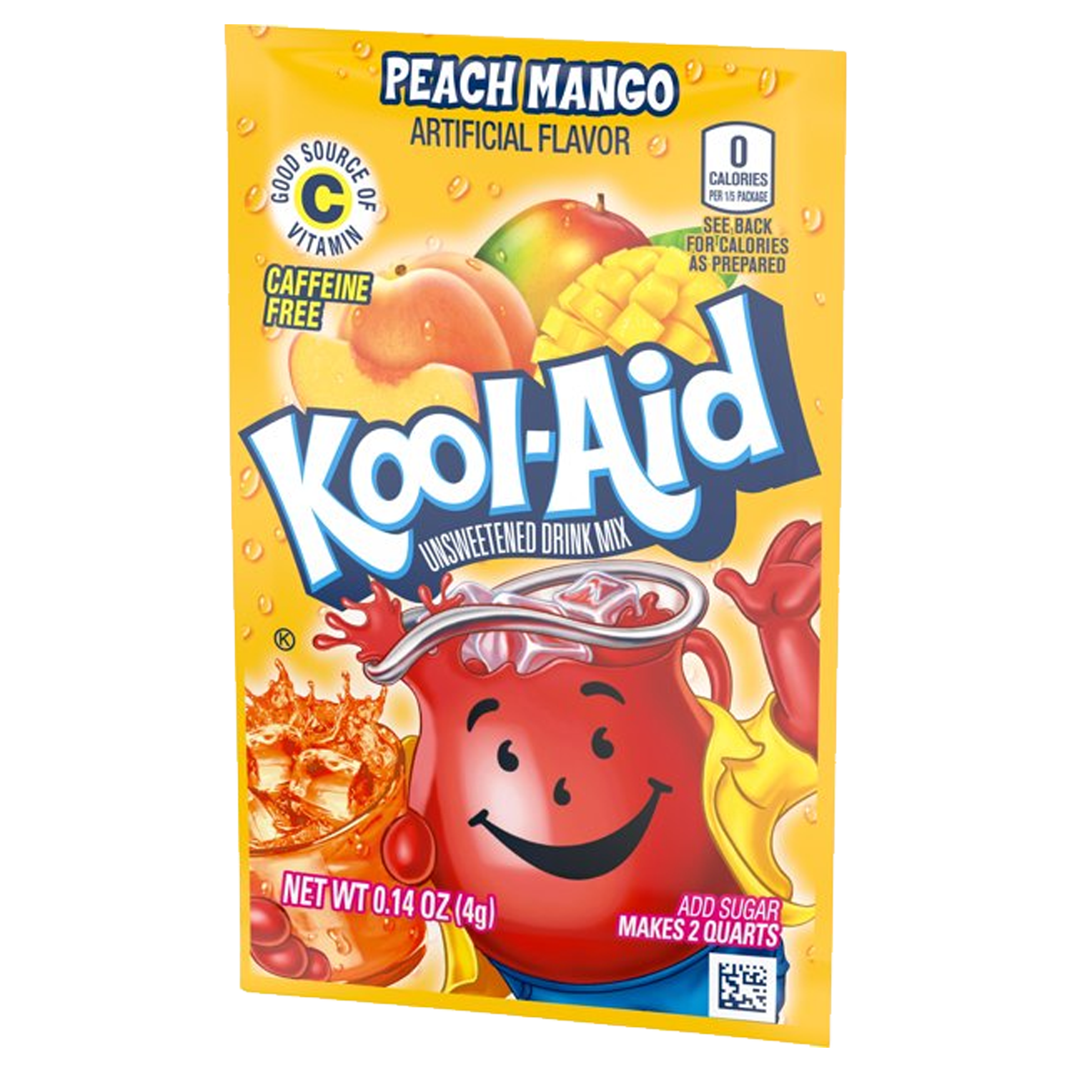 Kool-Aid Artificially Flavored Peach Mango Unsweetened Powdered Drink Mix is a delicious way to stay hydrated. This caffeine-free powdered drink mix makes it easy to prepare a tasty peach mango drink anywhere, just mix it with water and add your own sugar. Quench your thirst with the great taste of peach-mango drink. With zero sugar, zero calories and no caffeine, this artificially flavoured peach mango drink mix is always a great choice for the whole family. It's also a good source of vitamin C. These handy packets of drink powder ensure that you always have a refreshing beverage ready to go. Enjoy revitalizing peach-mango powdered drink mix at work or at home, or mix drink powder in a bottle of water to take on the go.