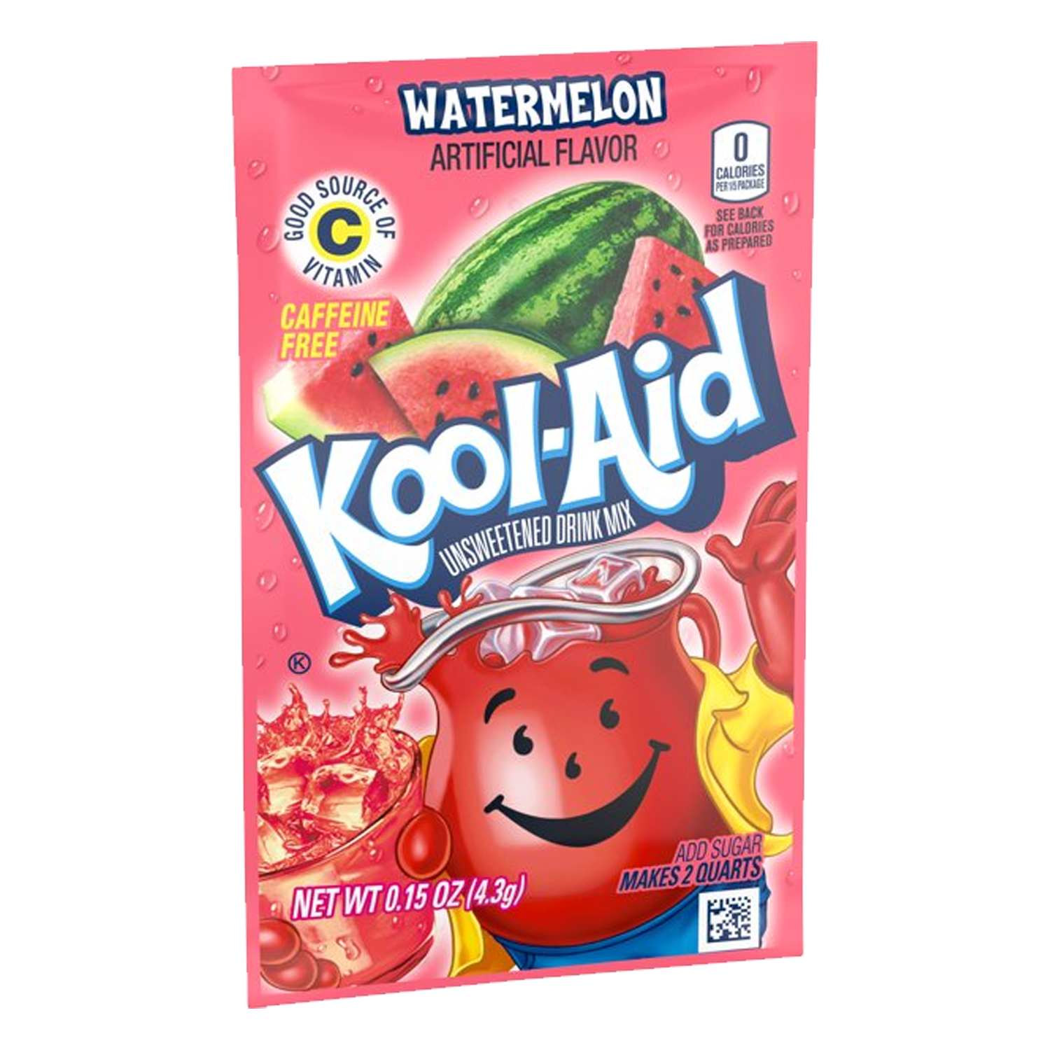 Kool-Aid Artificially Flavored Watermelon Unsweetened Powdered Drink Mix is a delicious way to stay hydrated. This unsweetened drink mix packet makes it easy to prepare a tasty red watermelon drink, just mix it with water and sugar or your sweetener of choice. Quench your thirst with the refreshingly sweet taste of watermelon. With no caffeine, this artificially flavoured powdered drink mix is always a great choice for the whole family. It's also a good source of vitamin C