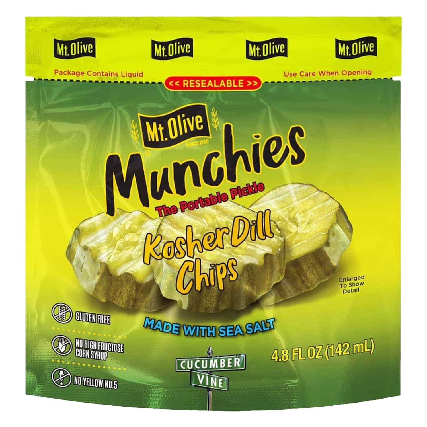 Enjoy the taste and crunch of our Munchies Kosher Dill Chips in a portable resealable pouch! Perfect for any time snacking!