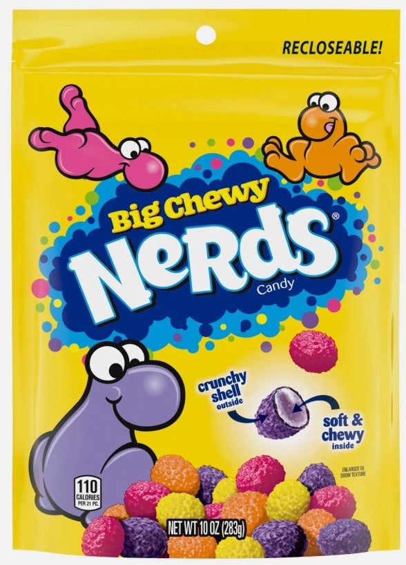 Experience a two-in-one candy sensation with the Nerds Big Chewy Candy Bag. This 283g bag is filled with larger, more substantial Nerds that offer the best of both worlds. Each candy starts with the iconic, crunchy texture of a classic Nerds shell, giving you that satisfying snap. But bite a little deeper, and you'll find a soft, chewy, and fruit-flavoured center that makes every piece an adventure.