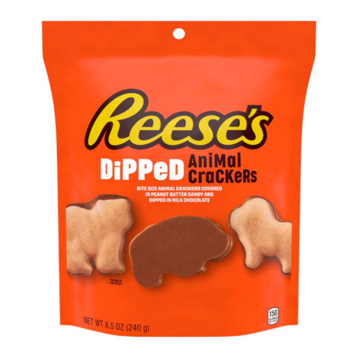 Crunchy, cute, and coated in chocolate! Reese’s Dipped Animal Crackers are bite-sized animal-shaped biscuits covered in smooth peanut butter candy and dipped in milk chocolate. Sweet, salty, and crunchy all at once — the ultimate snack for Reese’s fans.