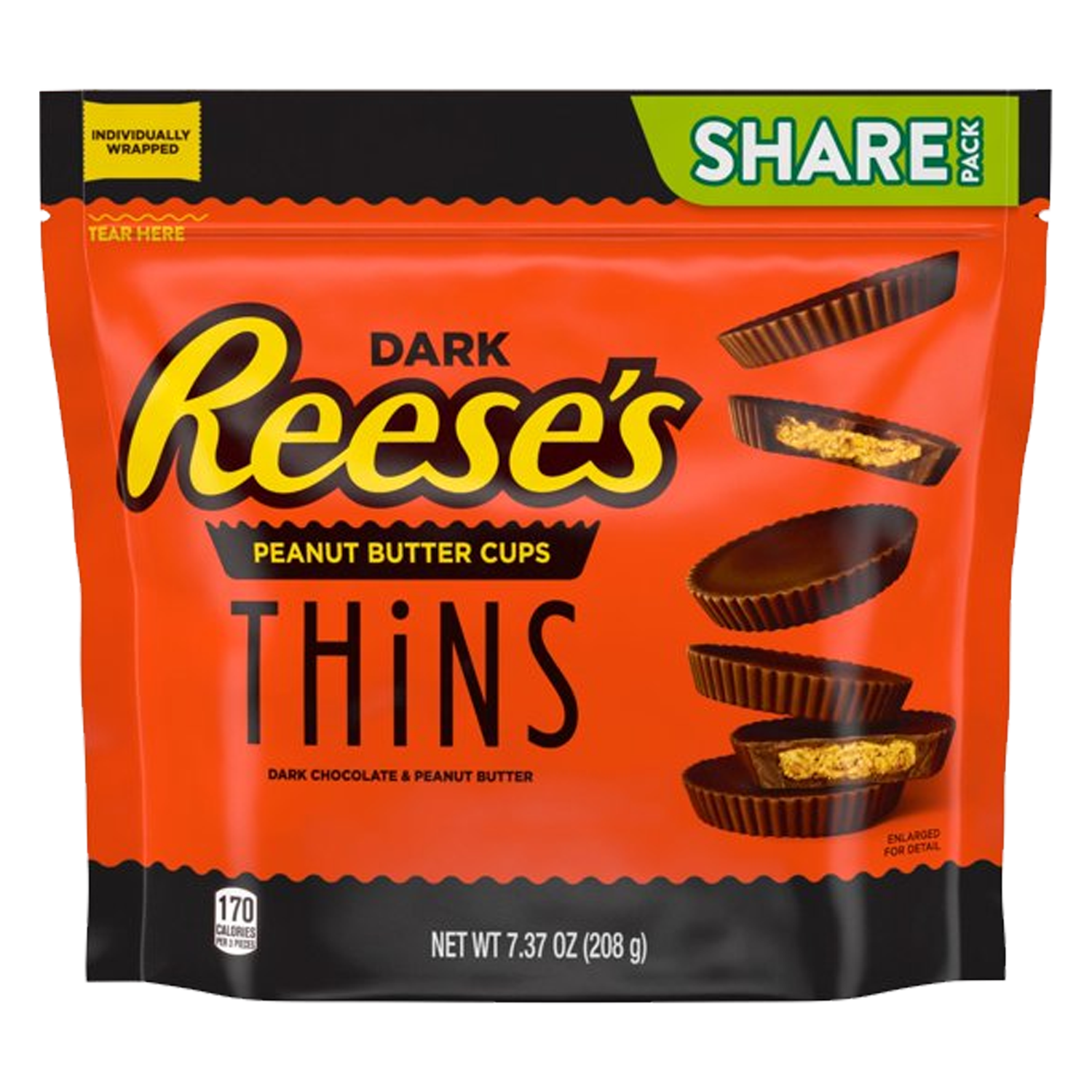 Indulge in the mildly sweet, creamy combination of dark chocolate and peanut butter with an extra snackable twist. REESE'S THiNS Dark Chocolate Peanut Butter Cups Candies are the same great flavour combination you already love but now in a thin cup perfectly sized for sharing and snacking. Keep this bag on hand for a quick bite of something sweet if you need an afternoon pick-me-up or want an easy on-the-go snack. Ready to kick your next movie night up a notch? Bring a bag of dark chocolate peanut butter cups for each guest, or share a bag of these individually wrapped candies to keep everyone happily snacking throughout the film. Keep your office breakroom, home candy bowls and kitchen pantry stocked with delectable kosher-certified treats featuring smooth dark chocolate and creamy sweet peanut butter. Whether you need a holiday stocking stuffer, Halloween costume party prize, Easter basket filler, Valentine's Day present or something just right for your home and office snack collections, REESE'S THiNS Dark Chocolate Peanut Butter Cups Candies have you covered. Even your best-baked goods will stand out with peanut butter cups toppings, so choose your favourite recipes and please the crowd with REESE'S THINS Candies.