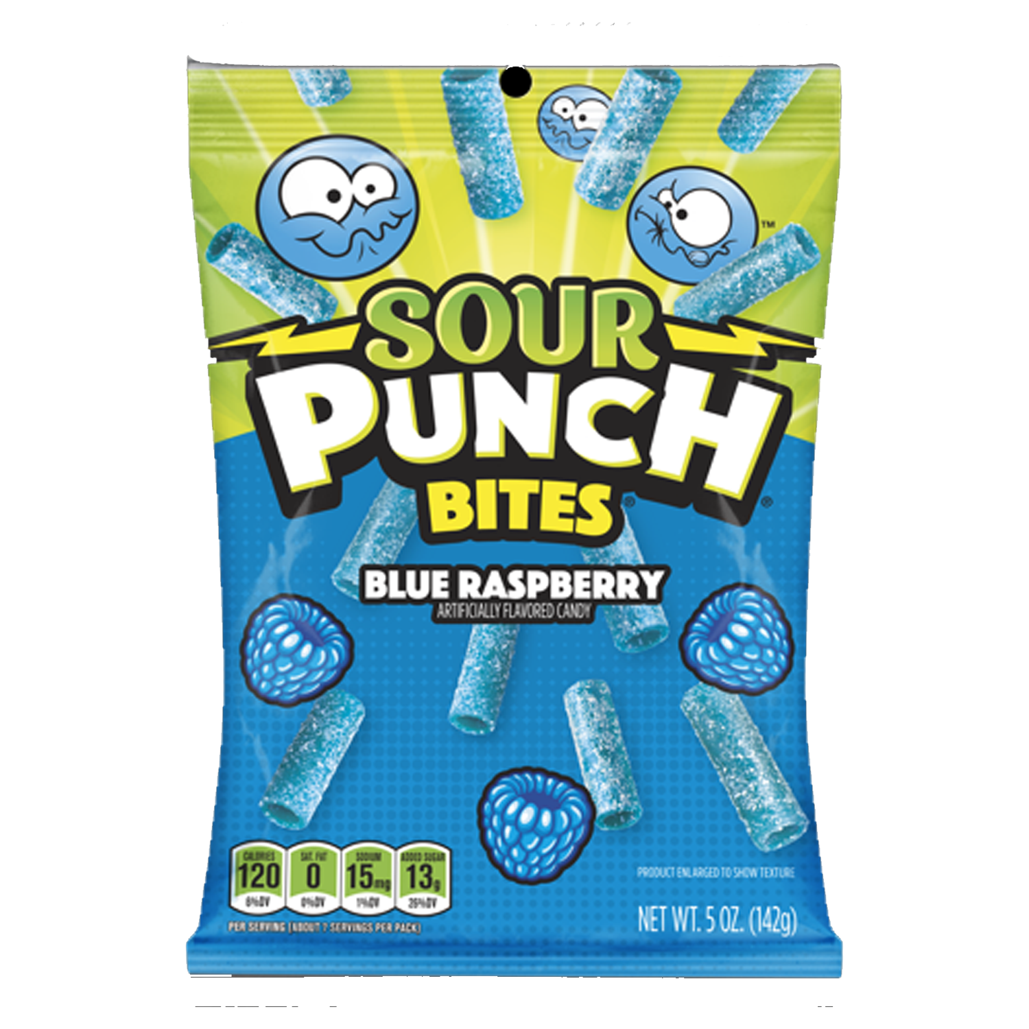 Sour Punch Bites are a soft and chewy fruit flavoured candy smothered in signature sour sugar coating. These Bites are bursting with blissful blue raspberry flavor, and the 5oz bag is the perfect size for snacks on the go. Indulge yourself in sweet & sour satisfaction and stash a bag in your office desk drawer.