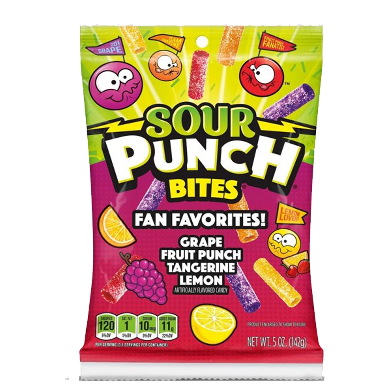 Don't miss out on new SOUR PUNCH® Bites Fan Favorites! Features 4 flavour favourites in one bag: Grape, Fruit Punch, Tangerine and Lemon.