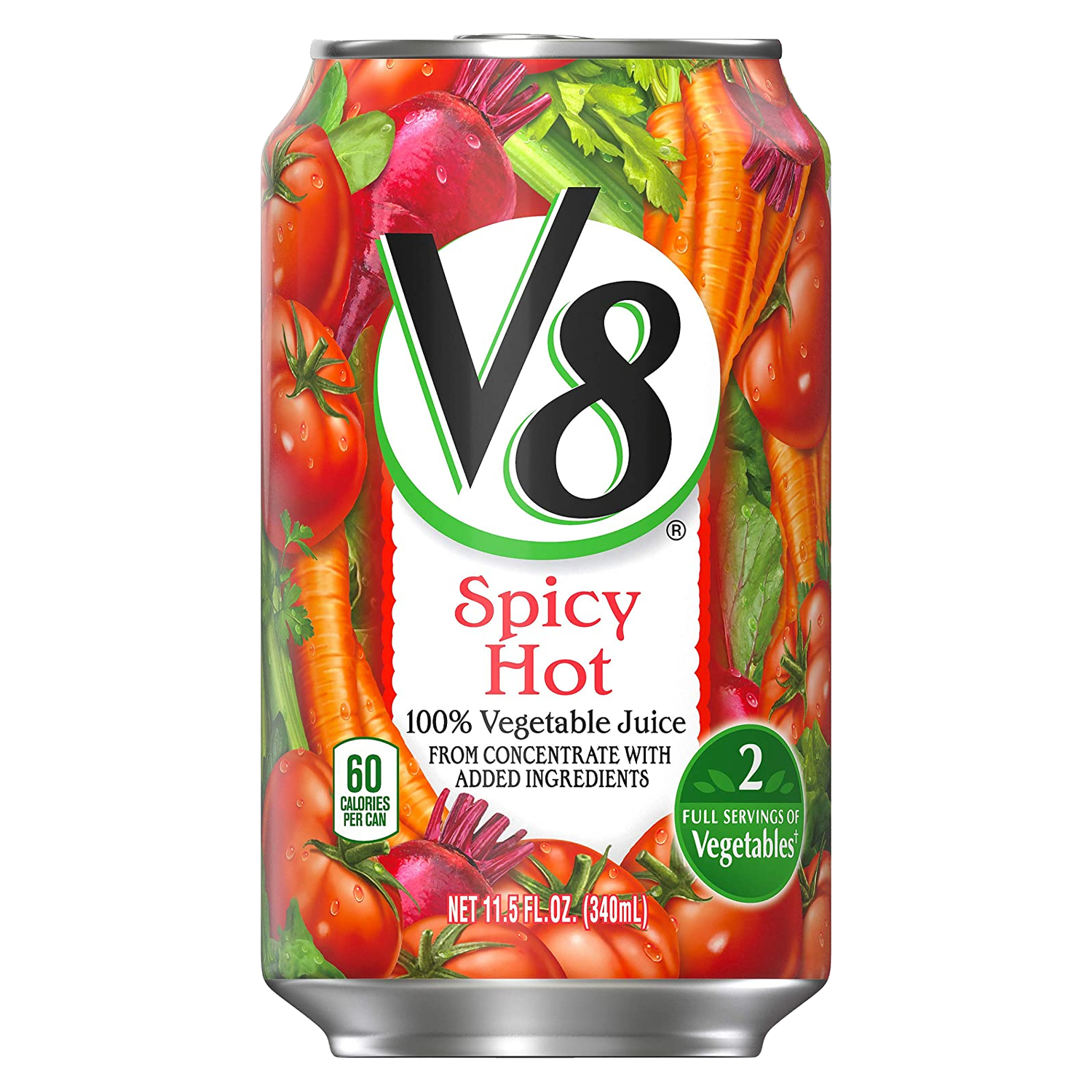 V8 Spicy Hot 100% Vegetable Juice is the trusted, nutritious plant-based drink that blends veggies you know and love with just the right amount of spicy hot kick. An excellent source of antioxidant vitamins without the added sugar, every 11.5 ounce can of this veggie juice has 2 full servings of veggies. Non-GMO, gluten-free, with no artificial colours, this spicy hot vegetable juice makes for a perfect veggie snack to jump start your day, satisfy your afternoon munchies, or help curb those late-night cravings! Taste the unquestionable goodness of V8 100% Vegetable Juice made from tomatoes and a blend of 7 other vegetables. The original plant-powered drink, V8 is full of feel-good nutrients your body needs like vitamins, minerals and antioxidants. Not to mention, adding vegetables to your day is an important part of a healthy diet. V8=Vegetables=Good. V8 Juice was born out of the idea that great taste and great nutrition can go hand in hand. For over 8 decades, that idea has thrived. Because getting the veggies you need in the drink you love fuels a day well-lived. V8.
