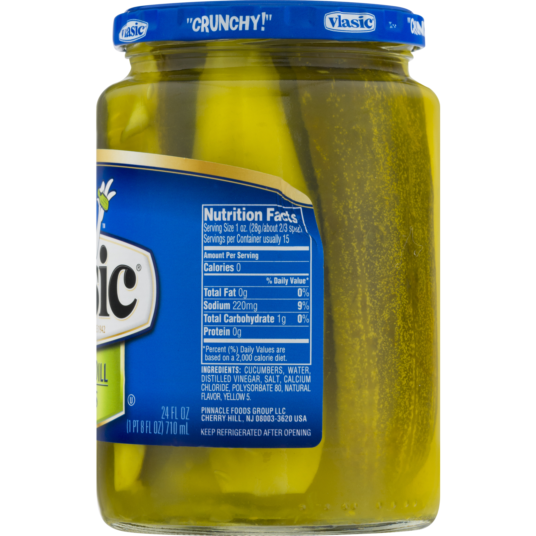 Add a bit of snap and crunch to your cuisine with these Vlasic Kosher Dill Spears Pickles 710ml Jar. They make a nice side to a turkey club sandwich, diced in a potato salad or stuff besides a grilled hot dog for a spectacular bite on a bun. This classic dill flavoured Vlasic Kosher pickle has zero calories per serving and each jar contains approximately 15 pieces.
